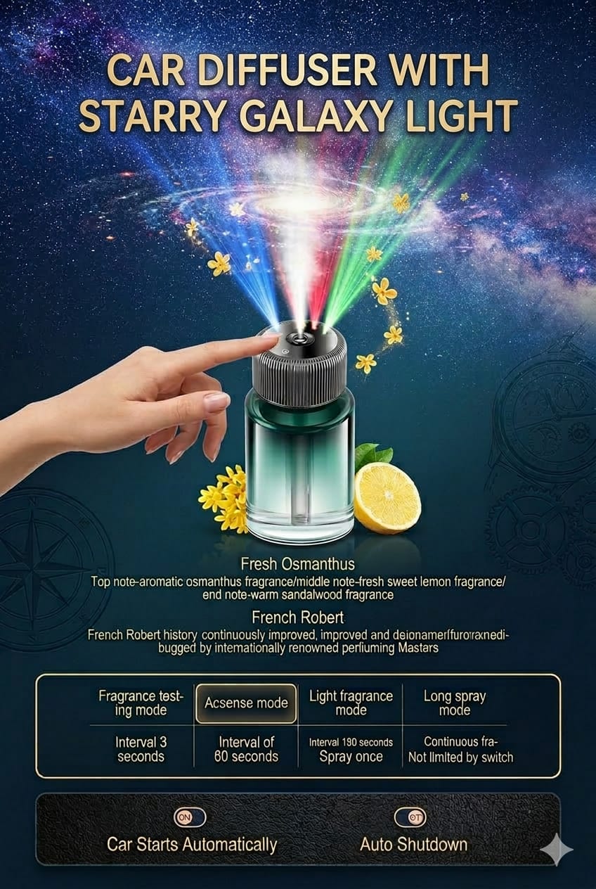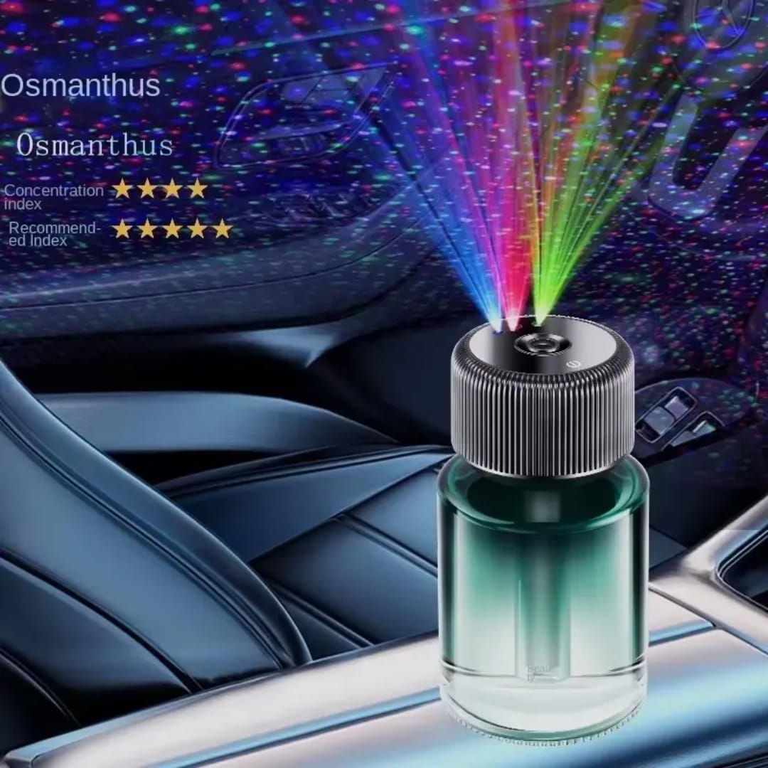 Elevate your driving experience with this 3-in-1 Starry Sky Car Diffuser. Combines automatic fragrance spraying, ambient humidification, and mesmerizing 3-color galaxy projection across your car’s ceiling.
