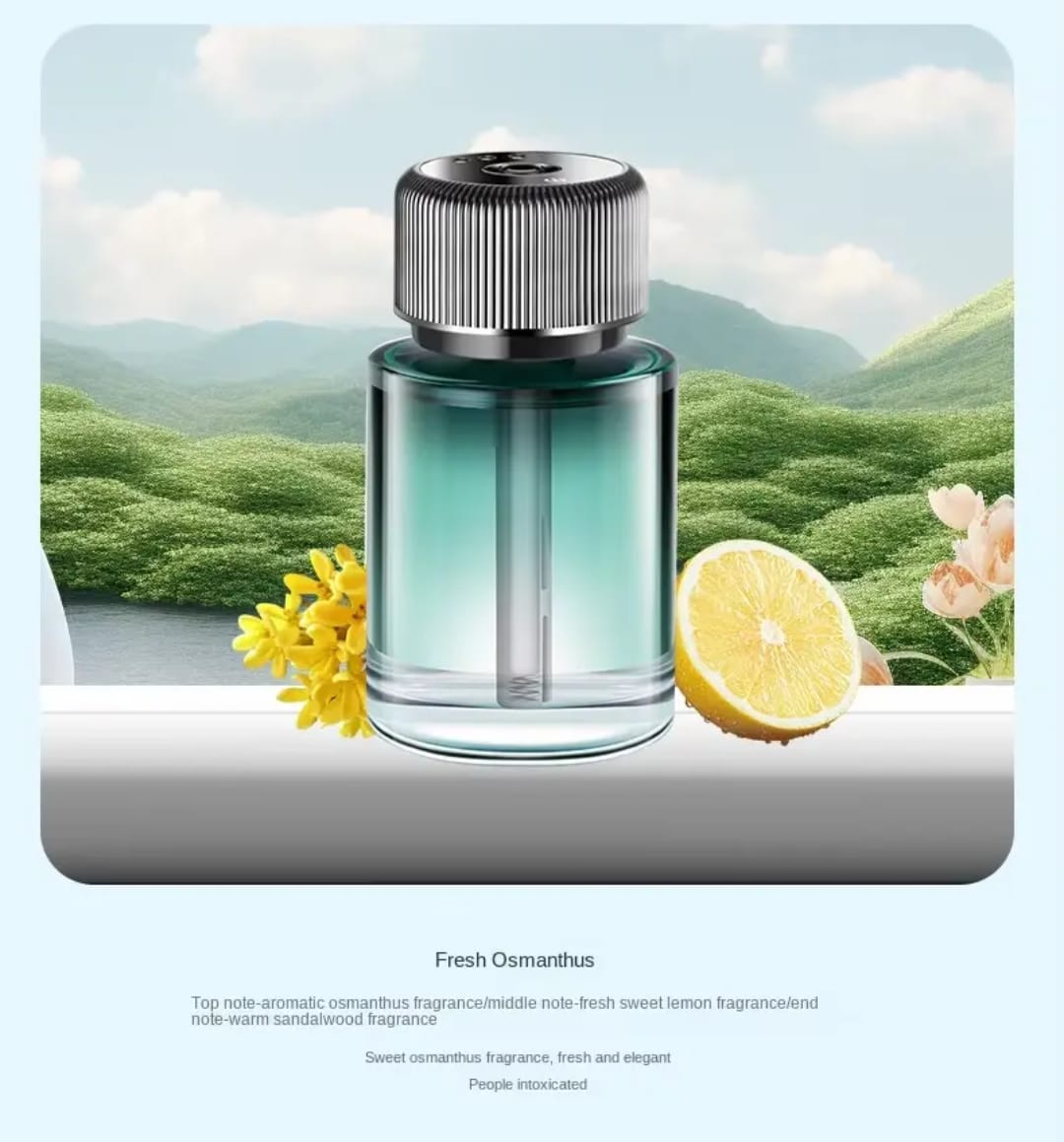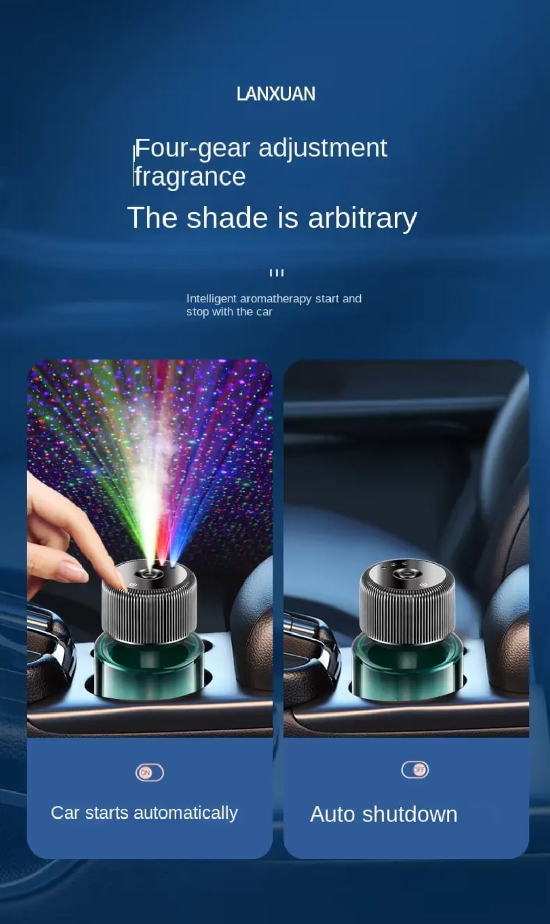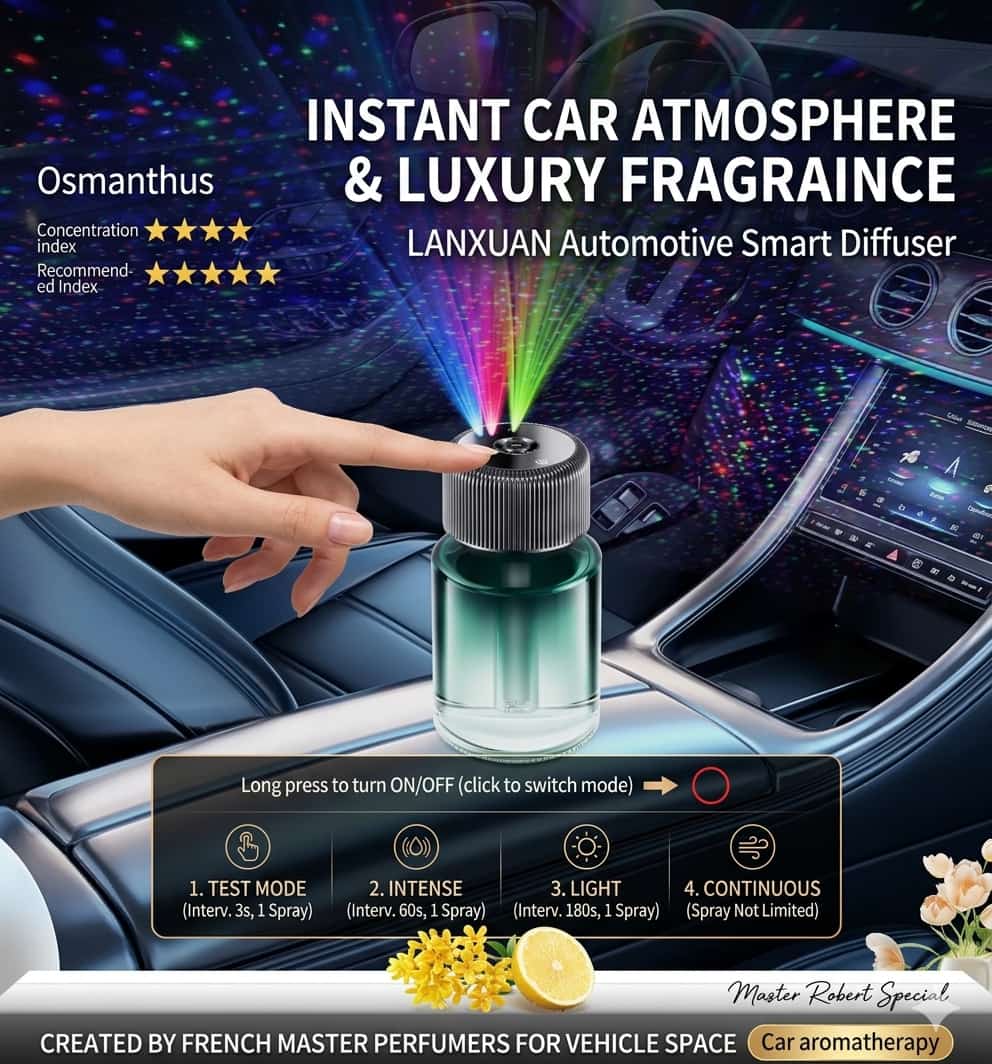 Premium glass bottle with intelligent sensors automatically activates when your car starts. Choose from soft white tea, floral, or ocean scents to create a personalized luxury atmosphere during every commute.[web:181][web:182]