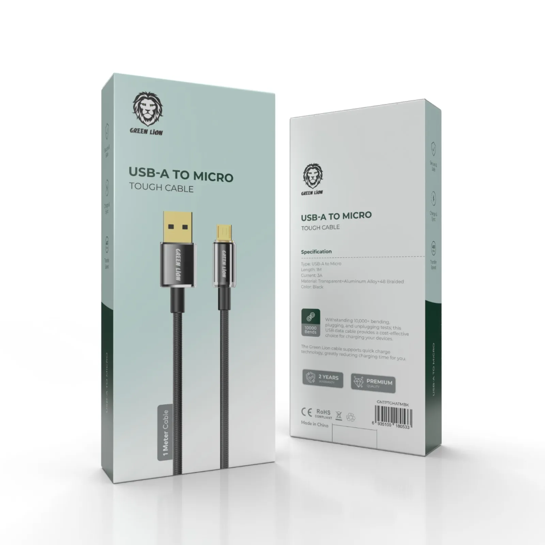 The Green Lion USB-A to Micro Tough1m) is an extremely tough cable engineered for fast charging and high-speed data transfer. Featuring USB-A to Micro connectors, 3A charging current, and a premium build of transparent plastic, aluminum alloy, and 48 braided strands, it offers unmatched durability and flexibility for everyday use.[2][3]