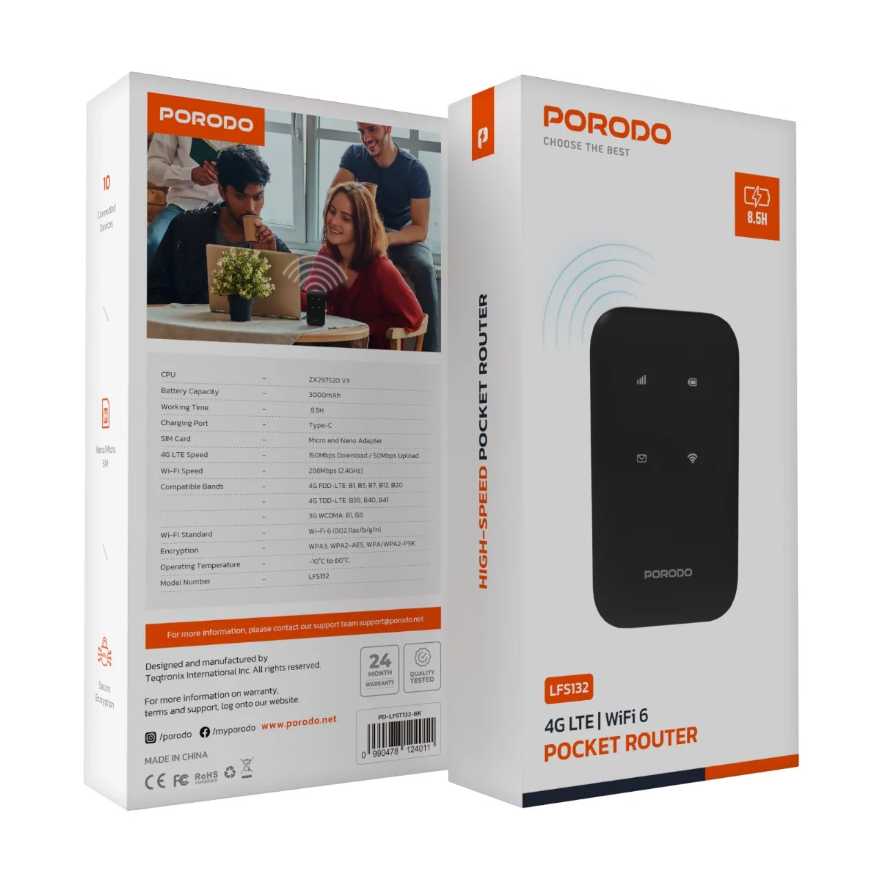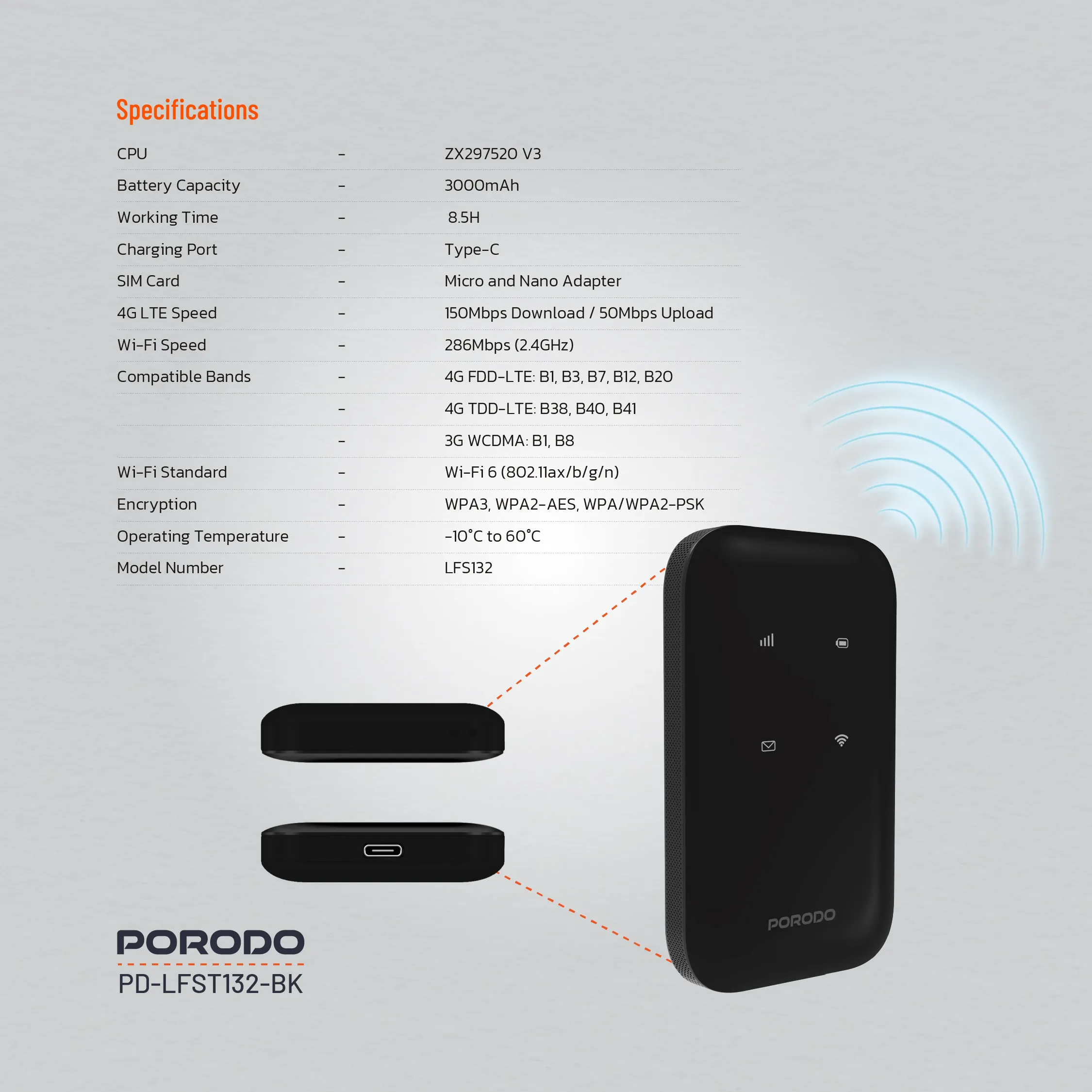 The Porodo 4G LTE WiFi 6 Pocket Router delivers steady, high-speed internet access anywhere with 150Mbps 4G LTE download and 50Mbps upload speeds[1]. Powered by the ZX297520 V3 CPU for smooth browsing and streaming, it features a 3000mAh battery providing up to 8.5 hours of continuous use[7] with convenient Type-C charging. Supporting WiFi 6 (802.11ax) at 286Mbps on 2.4GHz, WPA3 encryption, and up to 10 connected devices, it’s perfect for office, family, or travel use with Nano/Micro SIM compatibility