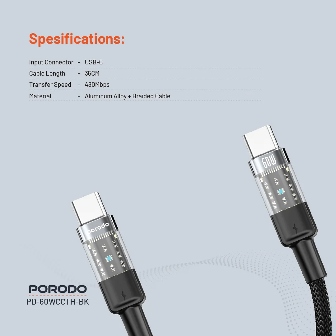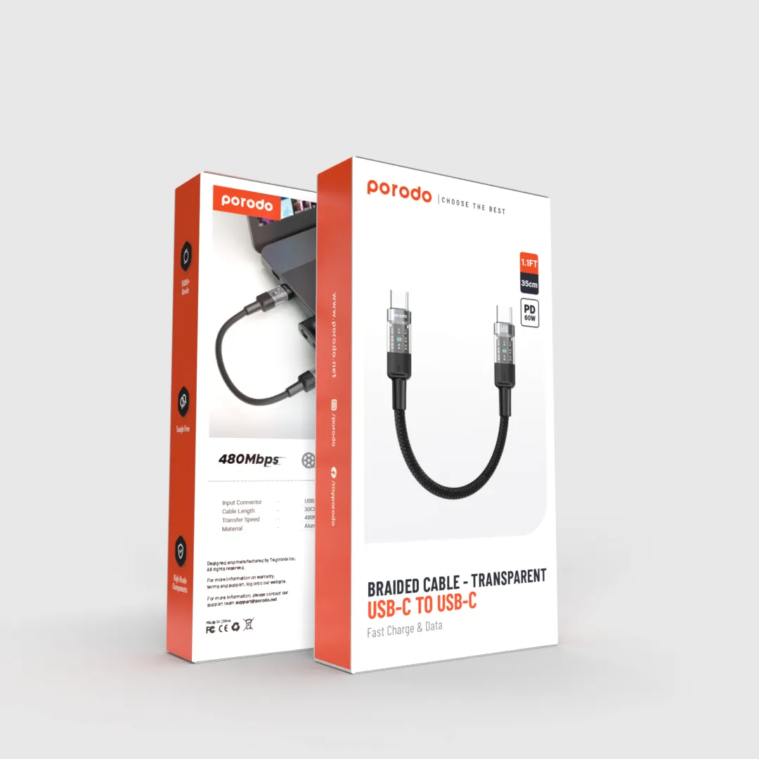 Unleash fast charging with the Porodo Braided 35cm, featuring transparent USB-C to USB-C connectors for a stylish tech upgrade. Delivering 60W PD fast charging and 480Mbps data transfer, this cable powers devices quickly while handling efficient file transfers. Constructed from aluminum alloy and braided cable, it endures 15,000+ bends tangle‑free, perfect for portable use[1].