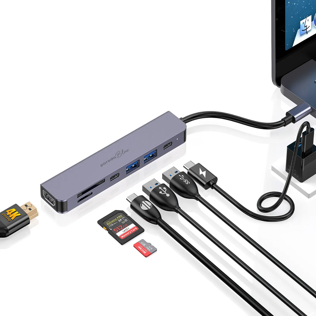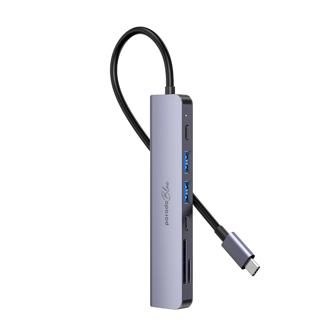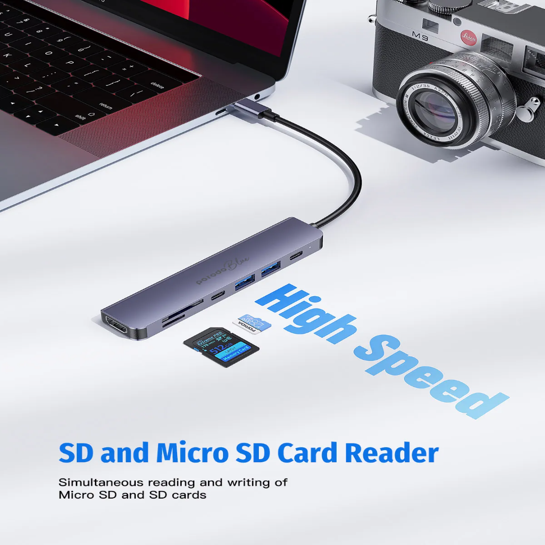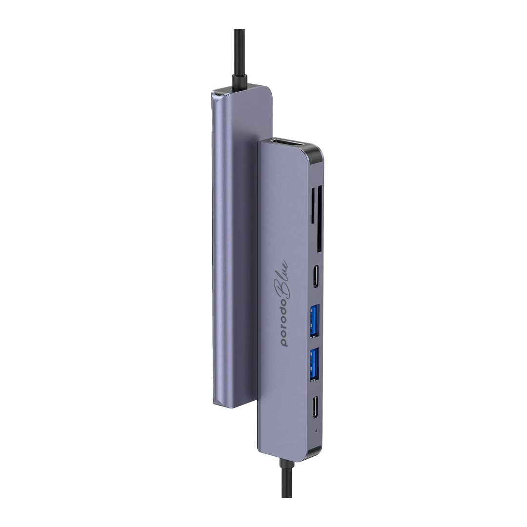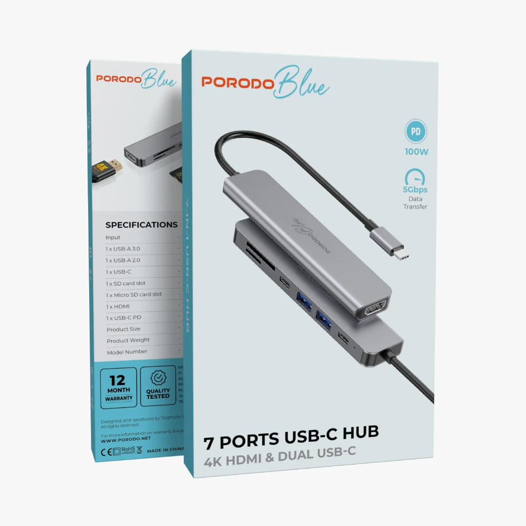 Porodo Blue 7-in-1 USB-C Hub is built for smoother connectivity when you need more ports for work, study, or travel. It combines HDMI video output, fast USB expansion, and SD/MicroSD card access in one compact hub, making it ideal for daily productivity and media setups.