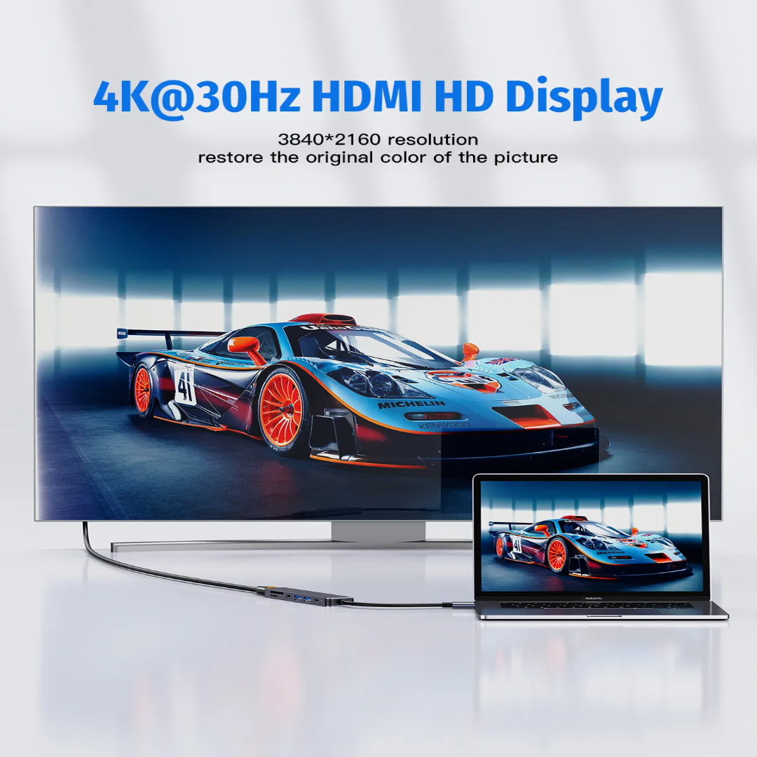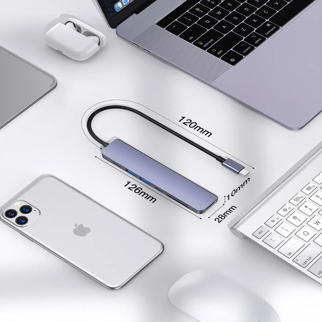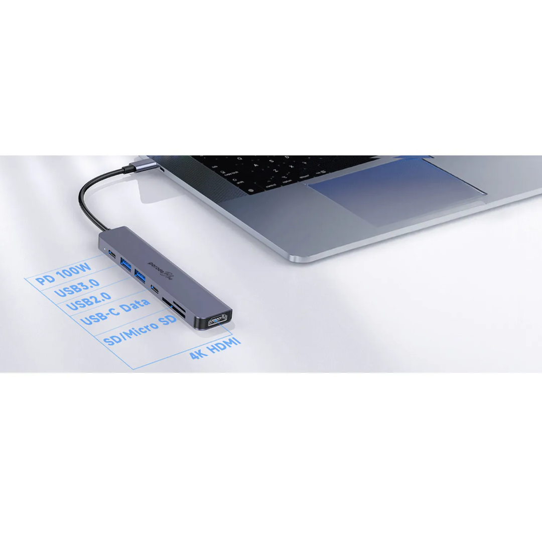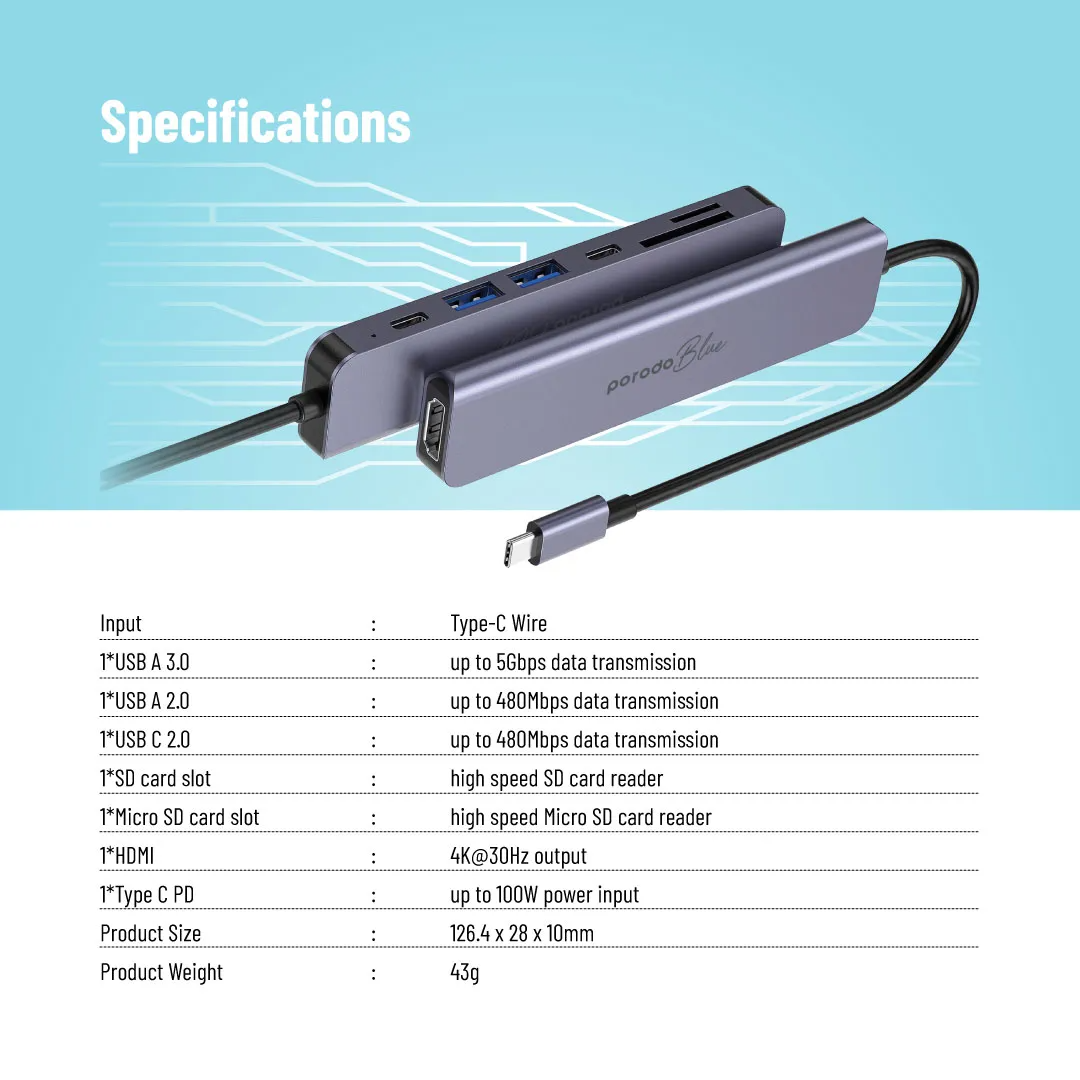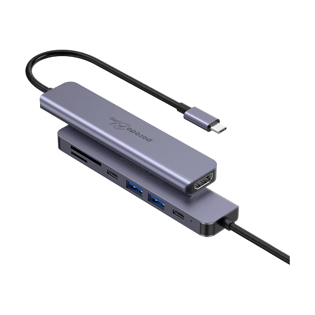 Porodo Blue 7-in-1 USB-C Hub is built for smoother connectivity when you need more ports for work, study, or travel. It combines HDMI video output, fast USB expansion, and SD/MicroSD card access in one compact hub, making it ideal for daily productivity and media setups.