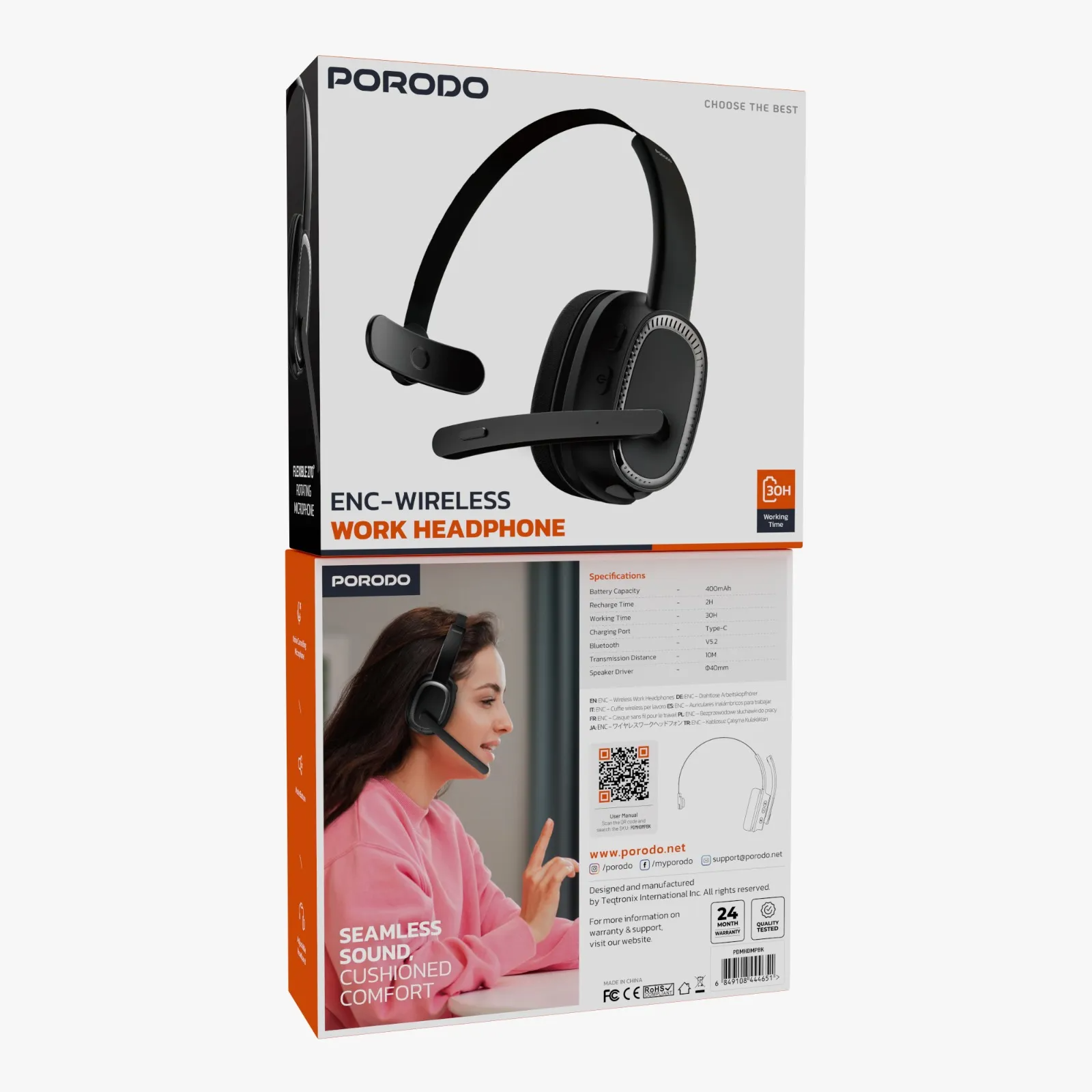 Porodo ENC Wireless Work Headphone — Noise-cancelling microphone, 15H battery, 1H fast charging, Bluetooth V5.2, 10m range, adjustable headband, mute button. Perfect for work.