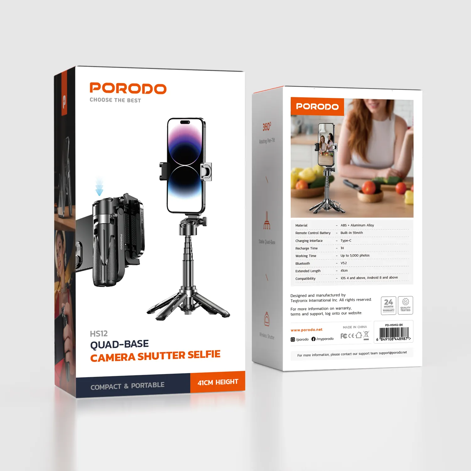 Capture every moment with the Porodo Foldable Selfie Stick, an extremely versatile and durable tool for every photography-loving enthusiast. Made with premium ABS and aluminum alloy, it features an extendable tripod design with a sturdy quad-base for steady, hands-free shots. A 360° rotatable pan-tilt provides dynamic angles, while the wireless Bluetooth V5.2 shutter enables you to take as many as 5,000 shots on a single charge. Perfect for adventuring on the go, thanks to the built-in rechargeable battery and compact foldable design.[5][6]