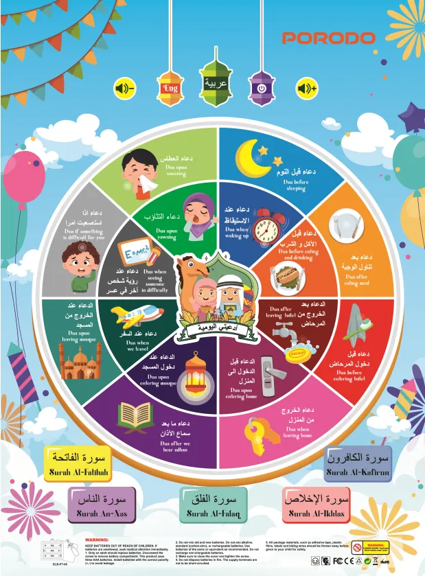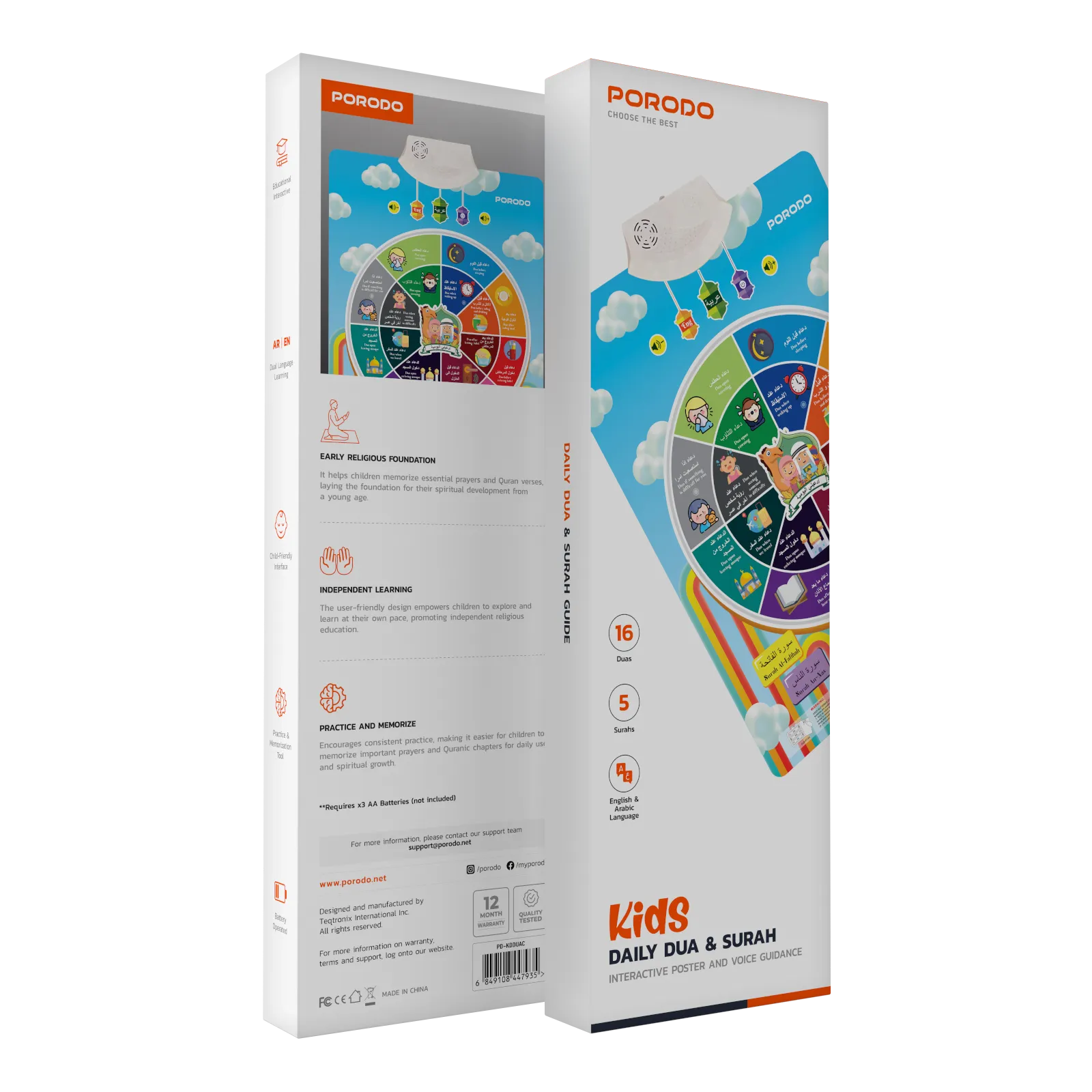 The Porodo Kids Daily Dua & Surah is an interactive, child-friendly learning device designed to help young learners practise and memorise essential Islamic prayers and verses. Lightweight and battery-operated, it offers a fun, self-guided way for children to build a strong religious foundation while improving bilingual (English & Arabic) skills.