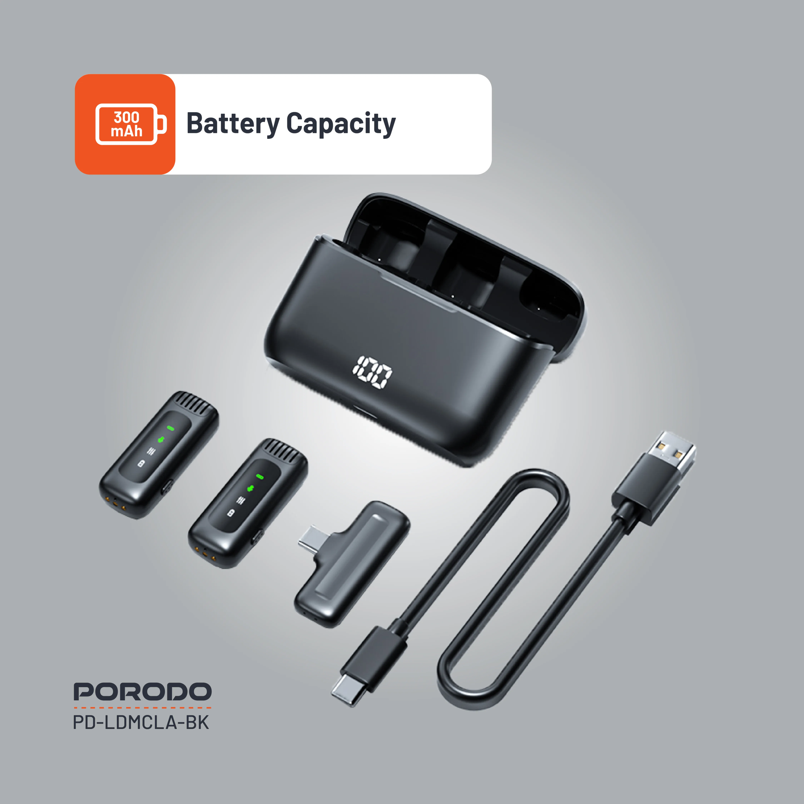 Porodo Lavalier Double Microphone w/ Charging Case — Dual mics, -30dB sensitivity, <20ms latency, 300mAh case (12H total), plug & play. Black.