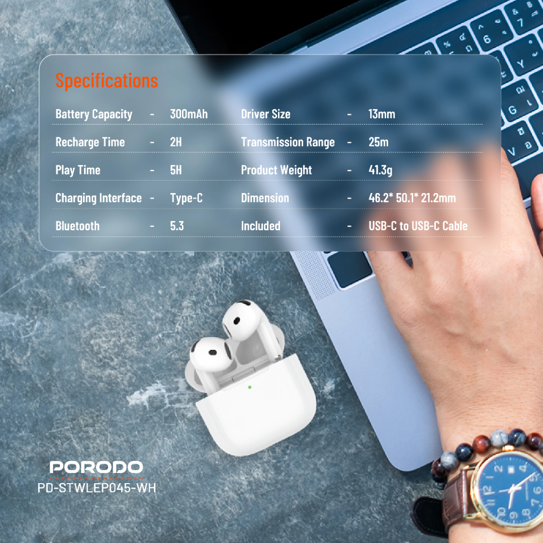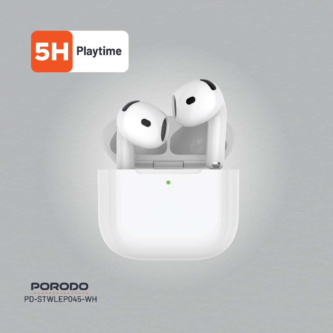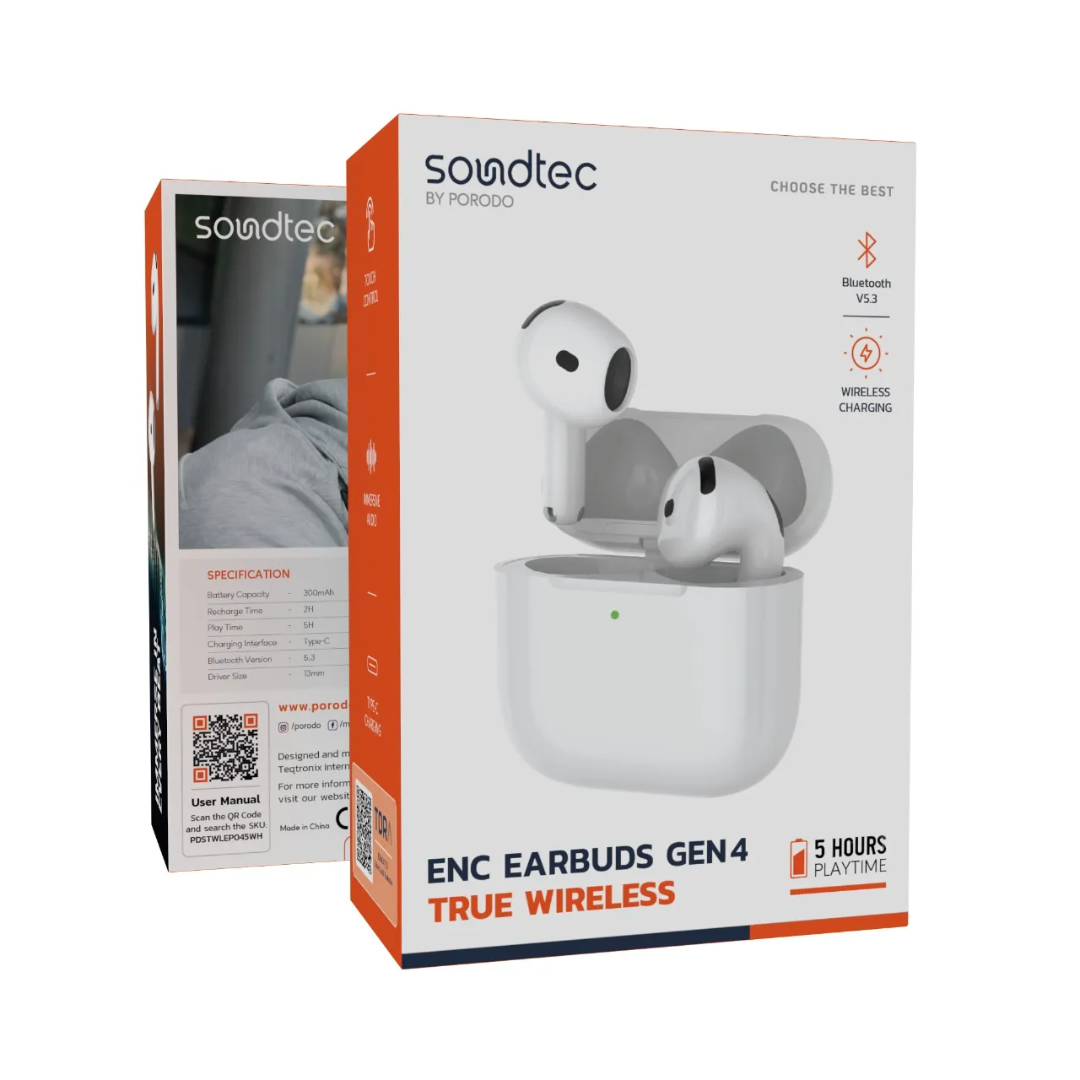 Porodo Soundtec Earbuds Gen 4 (White) deliver immersive sound with 13mm drivers and stable Bluetooth 5.3 connectivity up to 25m range. Powered by a 300mAh battery, they offer up to 5H play time and recharge in 2H using the included USB‑C to USB‑C cable, with touch controls plus wireless and Type‑C charging convenience.