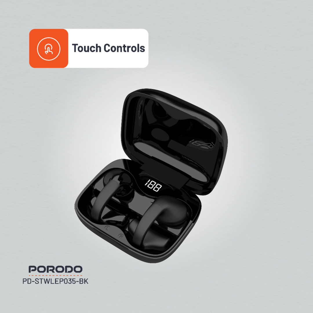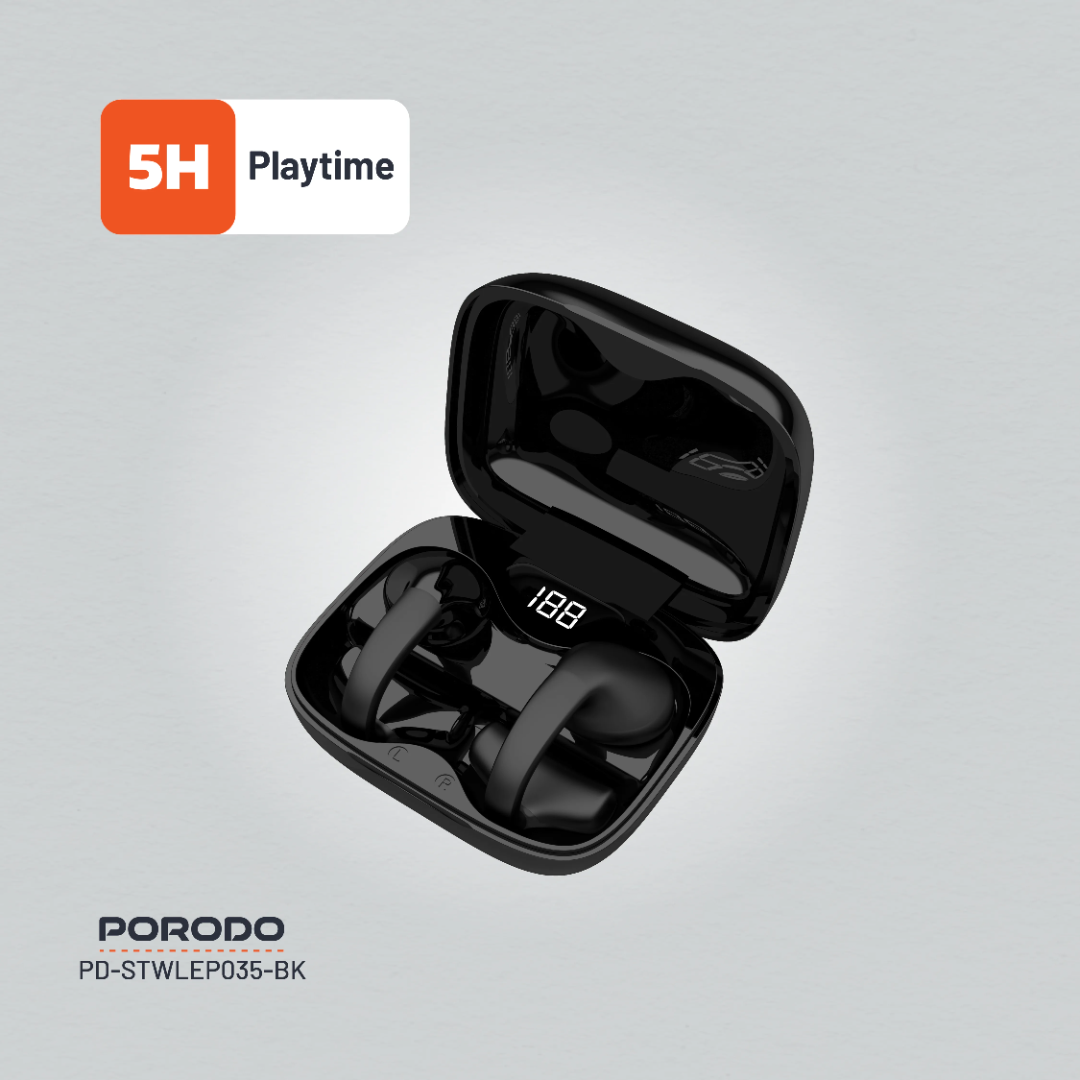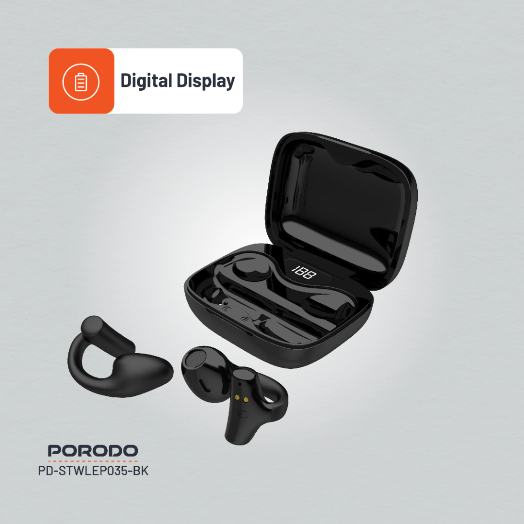 The Porodo Soundtec Snap Clip‑On Wireless Earbuds (Black) are designed for music lovers who want comfort, mobility, and a secure fit throughout the day. Powered by Bluetooth v5.3, they deliver stable connectivity with up to a 10 meter transmission range, operating within a 2.4GHz–2.4835GHz transmission frequency for reliable wireless performance. Get up to 5 hours playback on a single charge, and extend listening to up to 24 hours total with the charging case. The case includes a 300mAh battery, while each earbud has a 30mAh battery—great for daily commutes, workouts, and travel. A built‑in digital display keeps you updated on battery status, while touch controls make it easy to manage music and calls.