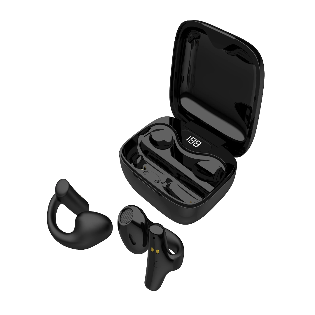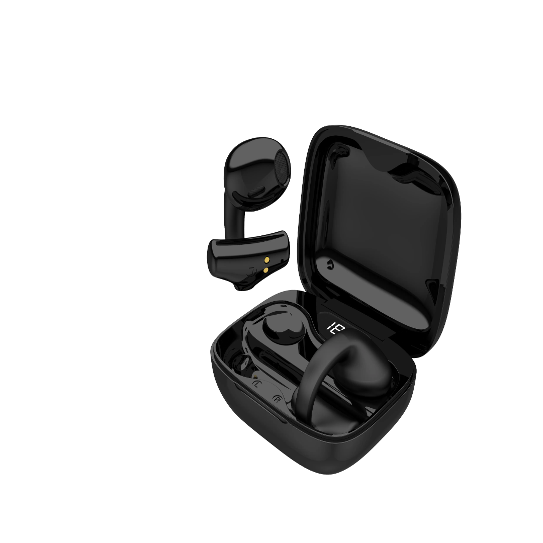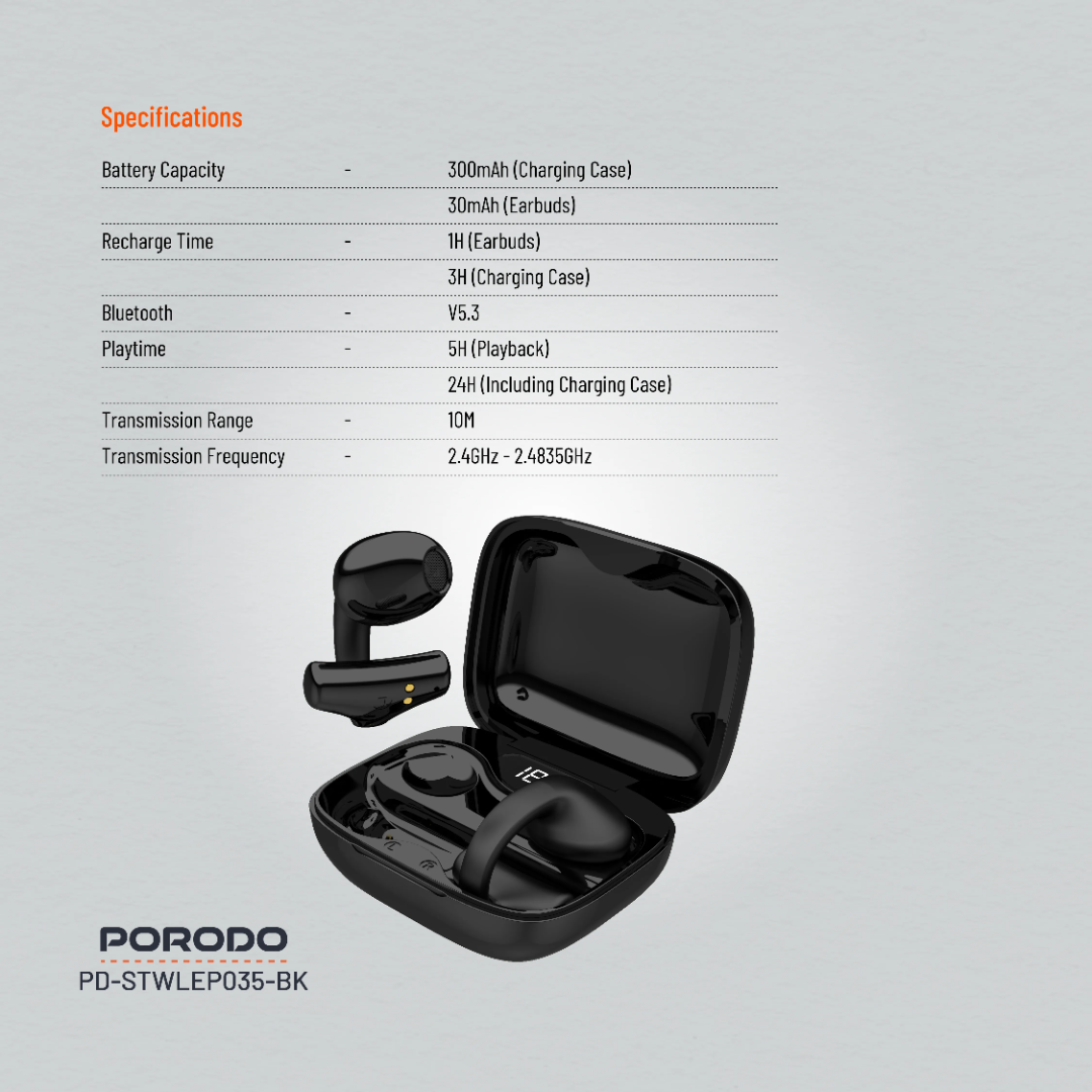 The Porodo Soundtec Snap Clip‑On Wireless Earbuds (Black) are designed for music lovers who want comfort, mobility, and a secure fit throughout the day. Powered by Bluetooth v5.3, they deliver stable connectivity with up to a 10 meter transmission range, operating within a 2.4GHz–2.4835GHz transmission frequency for reliable wireless performance. Get up to 5 hours playback on a single charge, and extend listening to up to 24 hours total with the charging case. The case includes a 300mAh battery, while each earbud has a 30mAh battery—great for daily commutes, workouts, and travel. A built‑in digital display keeps you updated on battery status, while touch controls make it easy to manage music and calls.
