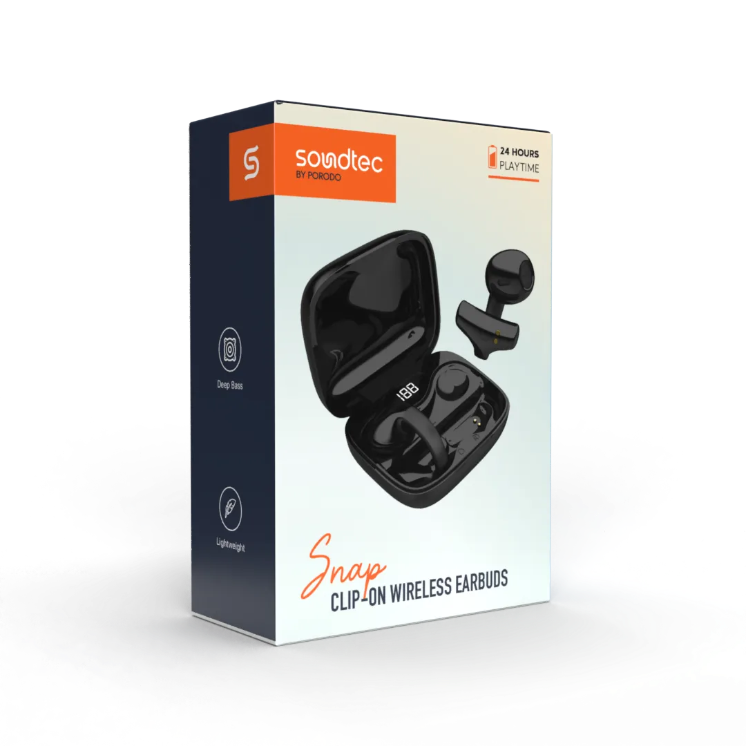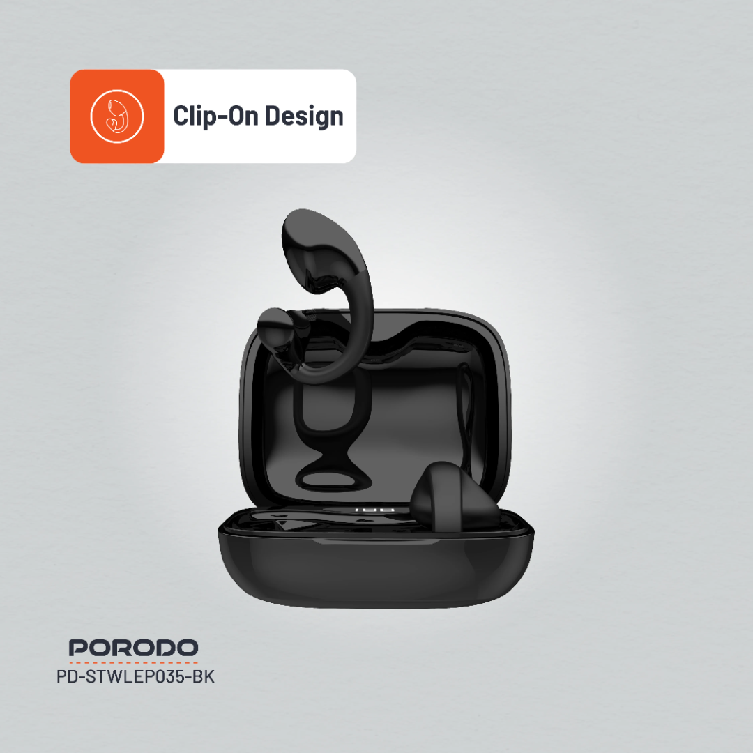 Order the Porodo Soundtec Snap Clip‑On Wireless Earbuds (Black) today.